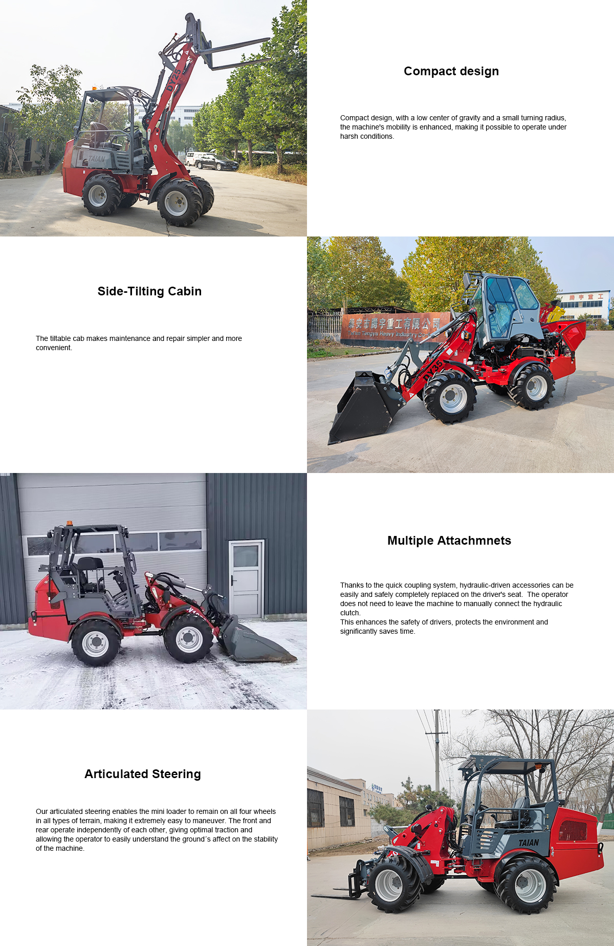 Compact design, low centre of gravity, tight turning radius and powerful performance, these features have characterized the TAIAN DY25/35/50 farm loader lines of products for years and still determine the immense success of the machines. The DY25/35/50 farm loader effortlessly fulfil any work task and work quickly, flexibly and safely – DY25/35/50 farm loader is simply always ready for use.