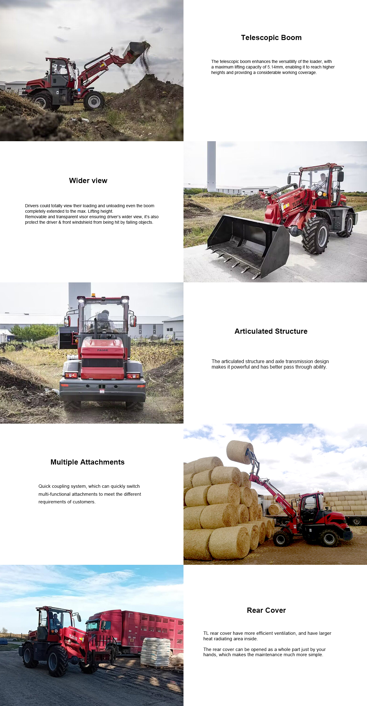 There are two models of TL series telescopic loader, TL1500 and TL2500, lifting capacity from 1 ton to 2.5 tons, can meet customers’ different demands. Also based on our rich experiences with loaders, we can also design according to customers’ special requirement.